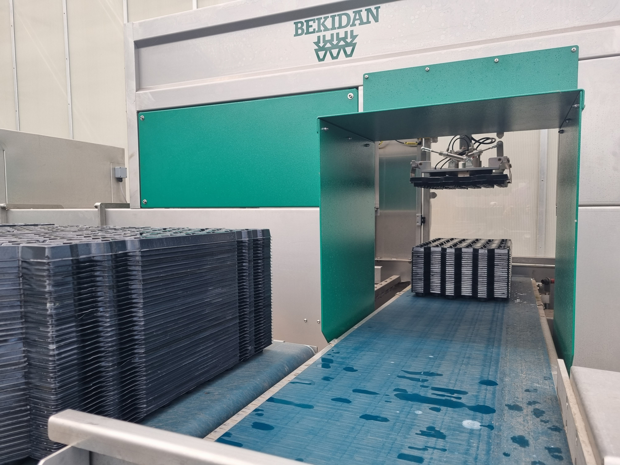 Merih, der er miljøansvarlig ved PKM, fortæller, at gartneriet i 2022 valgte at få udviklet og produceret en maskine til vask af formeringsbakkerne, på trods af et meget svært år. Målet er at vaske og genbruge bakkerne minimum 10 gange, før de sendes til genanvendelse hos leverandøren. Processen foregår uden brug af kemi og tælleren er allerede over 400.000 stk.