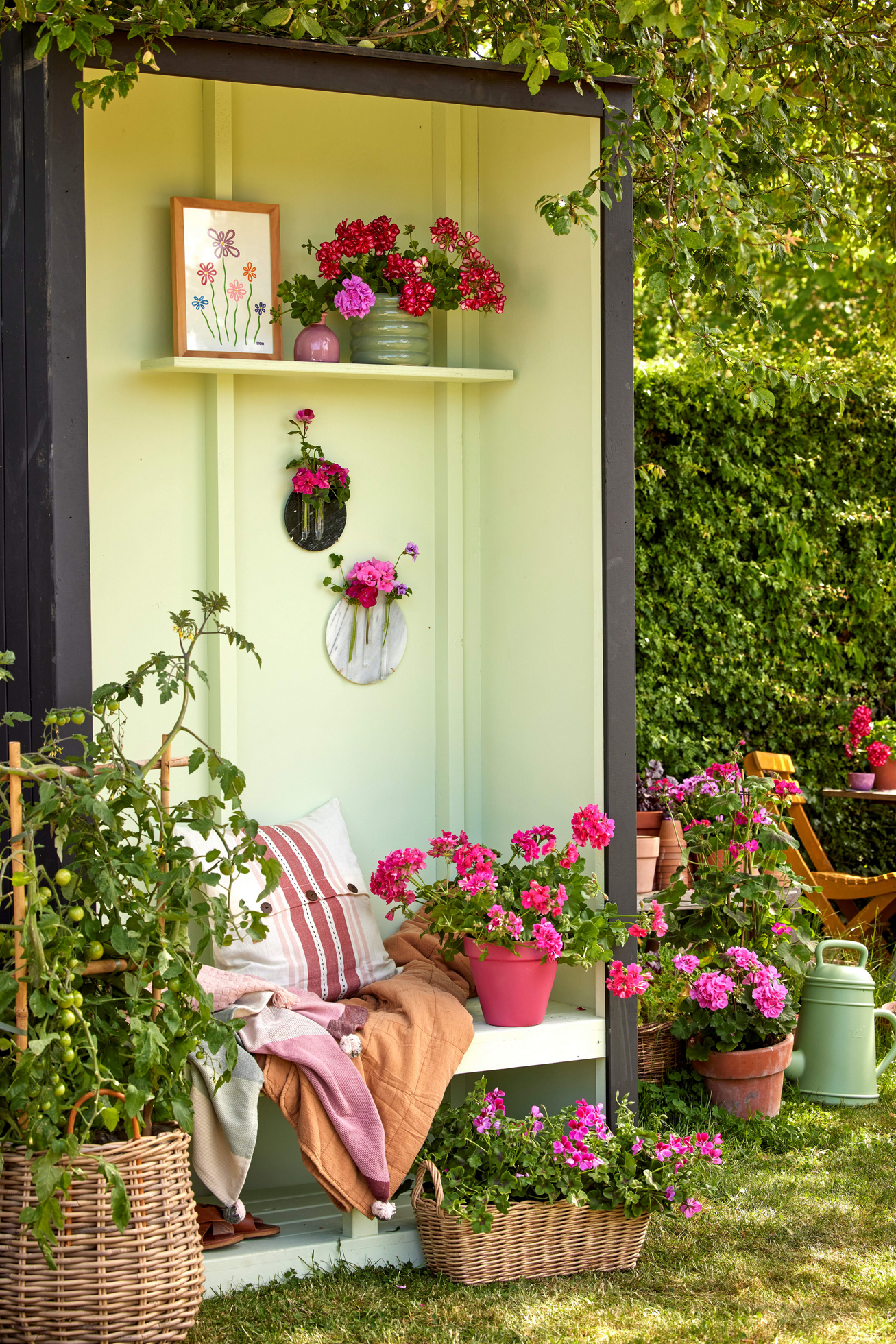 Den håndlavede overdækkede bænk på billedet til venstre ovenfor minder lidt om en traditionel bænk ved havet. Den giver beskyttelse mod vinden og elementerne, hvilket gør pladsen til det perfekte sted til hyggelig afslapningstid i din egen have. Farverige pelargonier i krukker og kurve skaber sammen med dekorativt tilbehør en feriefølelse.