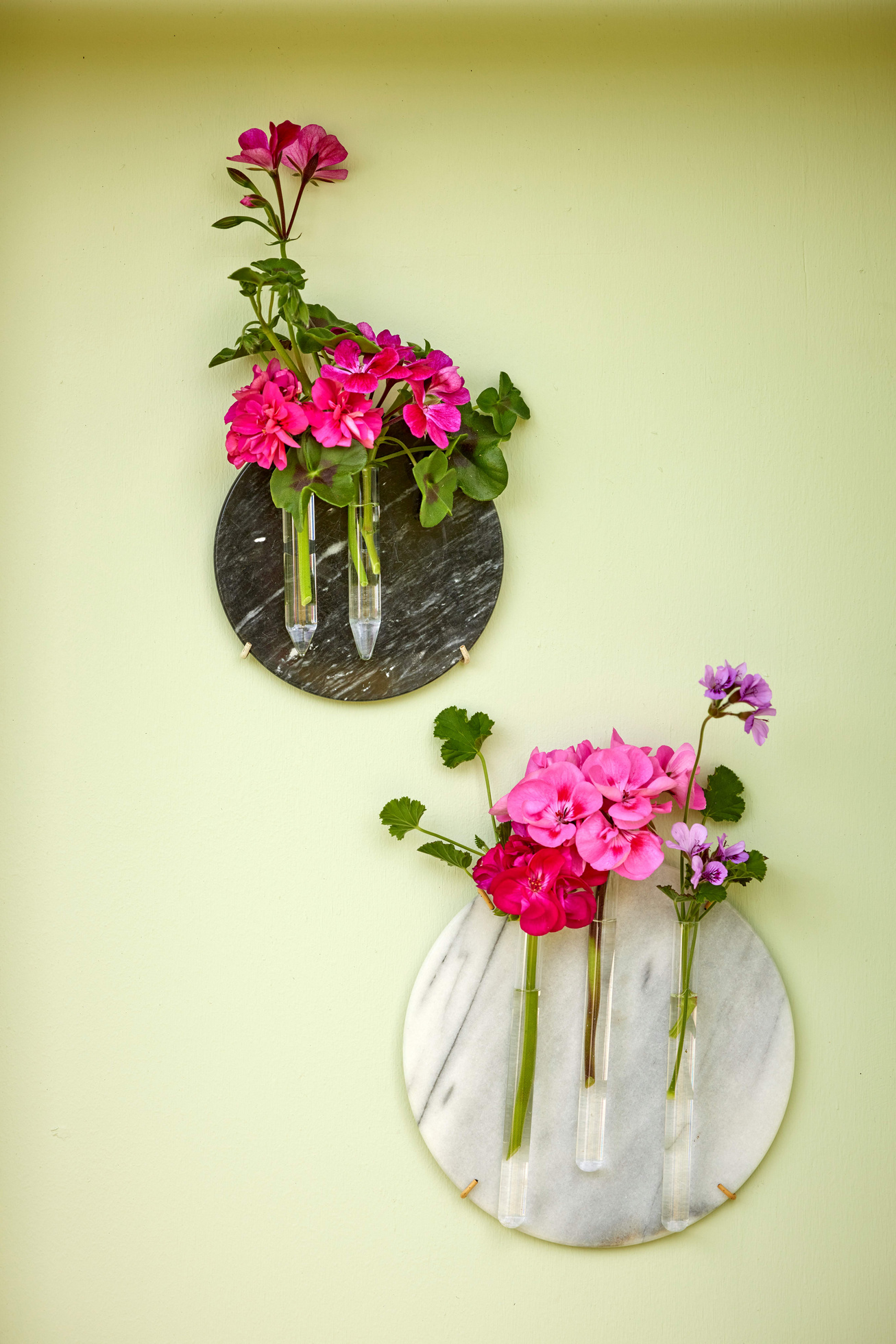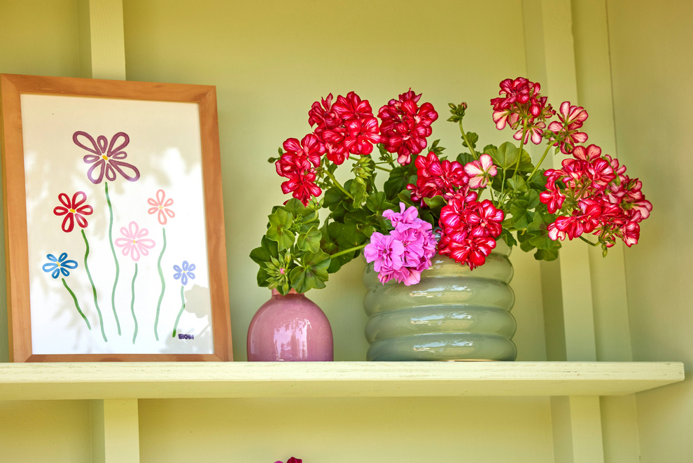 Klippede pelargonieblomster, placeret i vaser på en hylde eller i en håndlavet vægophæng, giver en ekstra dosis blomstermagi. Sidstnævnte ser sofistikeret ud, men er virkelig ligetil at lave. Fastgør blot reagensglas til cirkulære marmorskiver med varm lim, fyld rørene med vand, put afskårne pelargonieblomster i dem og fastgør det hele til væggen ved hjælp af specielle pladeophæng.