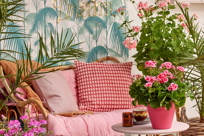I dette interiør med en eksotisk udendørs stemning giver farverige pelargonier i potter og kurve positive vibes, mens indendørs palmer, jungletapet og møbler i boho-stil skaber en afslappet atmosfære.