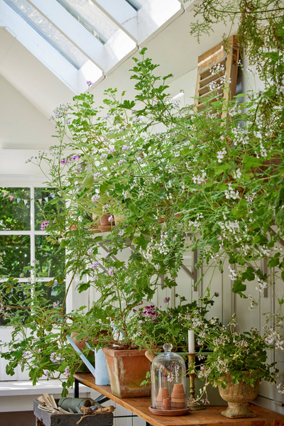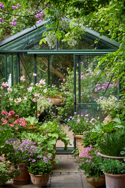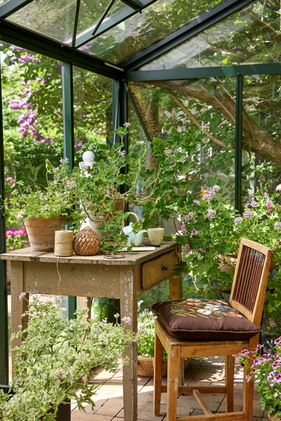 Frodig vegetation forvandler dette drivhus og den omkringliggende have til et magisk paradis - en drøm for enhver planteelsker. Pelargonier er i centrum i dette blomstrende univers. Placeret i potter og kurve vil de med deres overflod af blomster fra forår til efterår give blomsterglæde. Udvalgte vintage møbler og tilbehør forstærker den hyggelige følelse.
