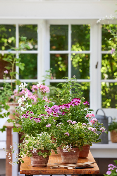 Med de rigtige møbler, tilbehør og planter kan overgangsrum mellem indendørs og udendørs blive hyggelige tilflugtssteder. Lette og varmeelskende planter som pelargonier er perfekte til de særlige vækstbetingelser skabt under glas. De hjælper med at skabe en feel-good atmosfære med deres frodige vækst og forskellige farverige blomster.