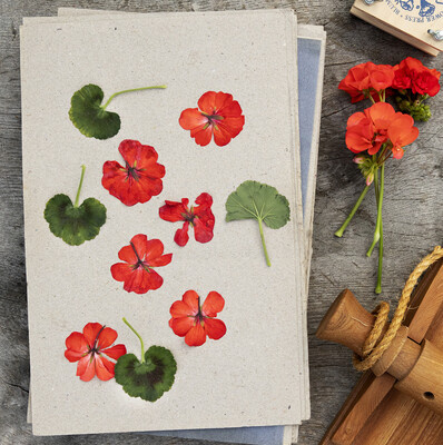 Du kan skabe smukke hjemmelavede kunstværker med pressede blomster og blade fra pelargonier. En tyk bog er ideel til presning. Placer blottingpapir eller printerpapir mellem bogsiderne og blomsterne for at forhindre, at bogens sider misfarves eller krølles. Eller du kan også bruge en blomsterpresse. Tip: Brug altid friske, ubeskadigede blomster, så de bevarer deres oprindelige farve og struktur efter tørring. Når du presser, skal du sørge for, at blomsterne ikke rører hinanden, ellers klæber de sammen, når de tørrer.